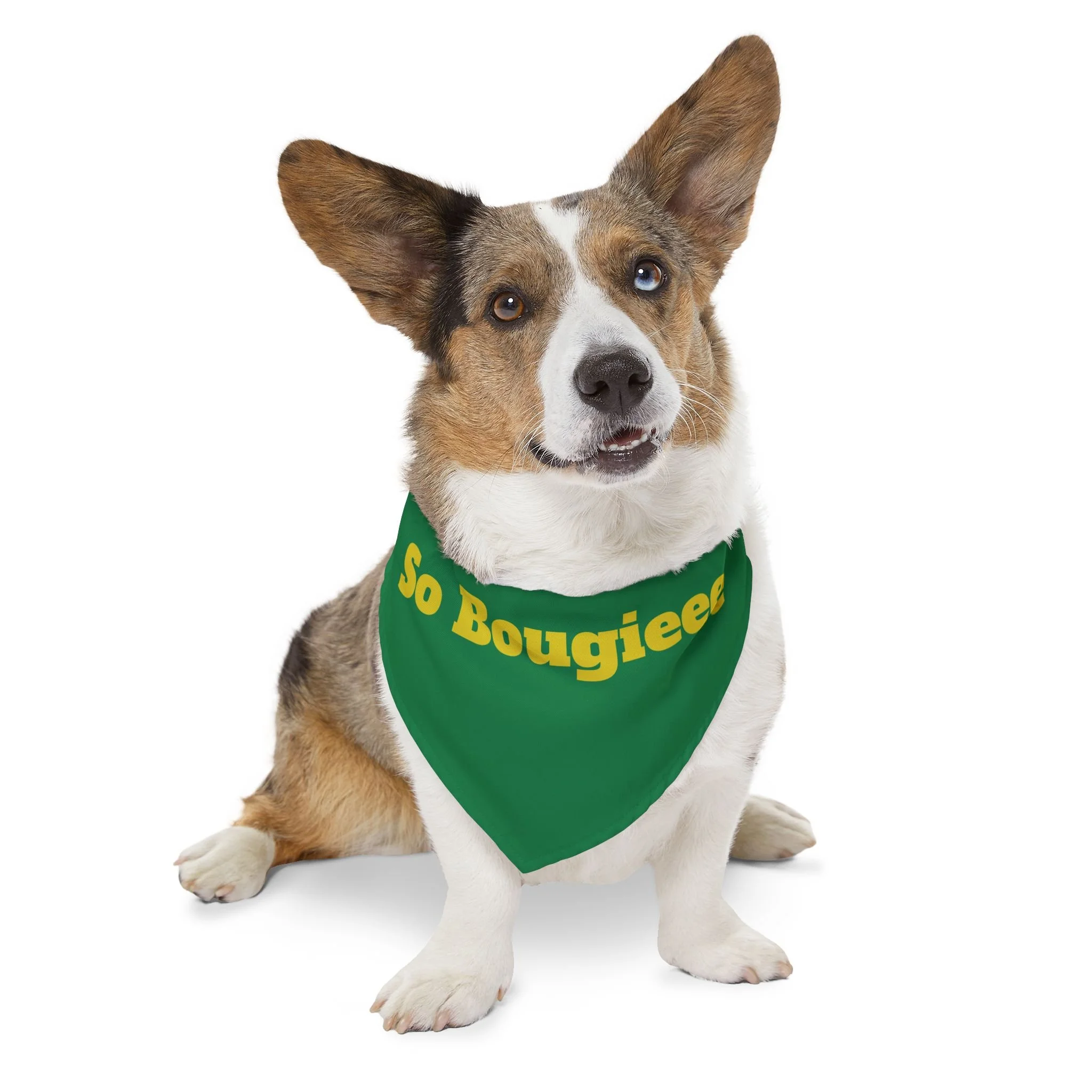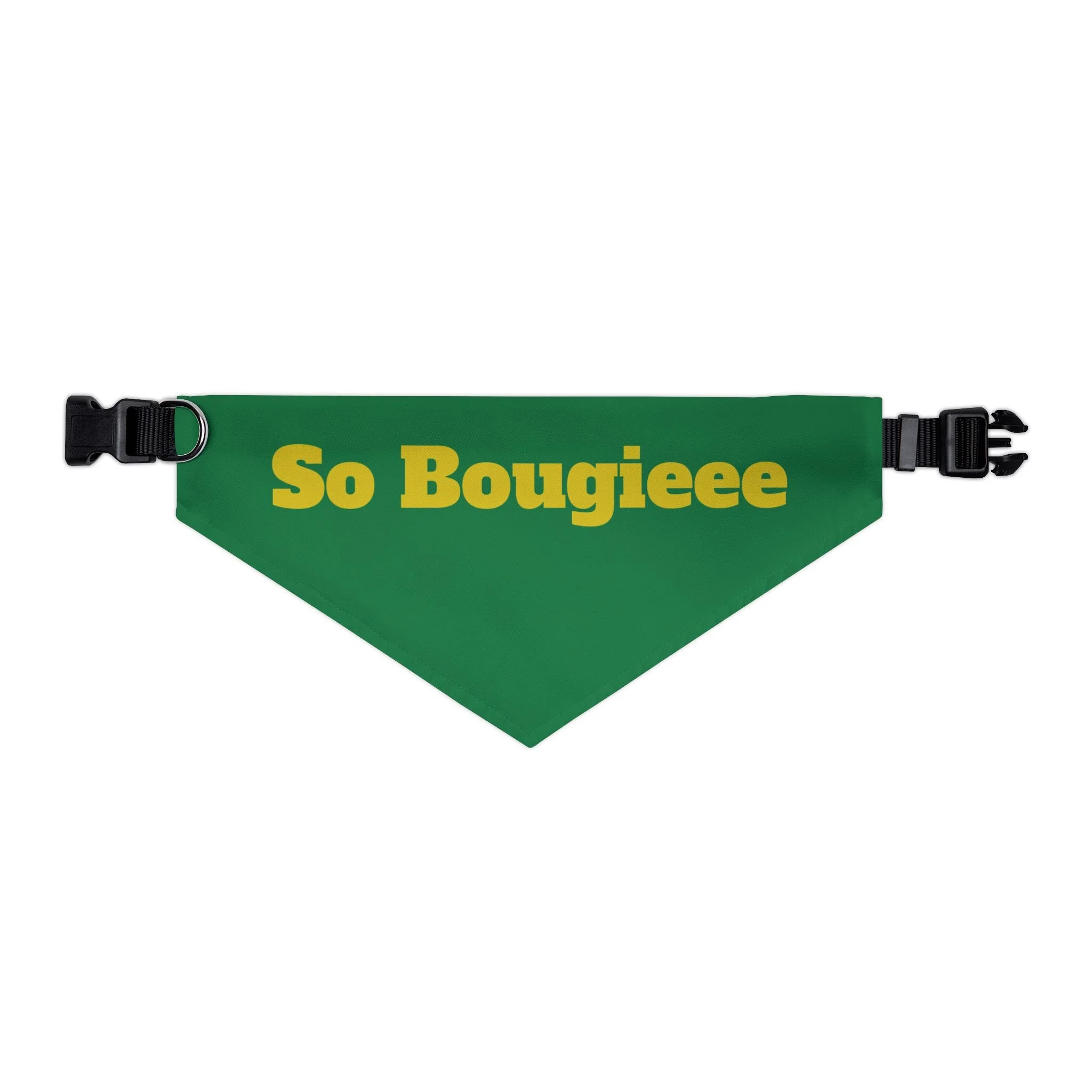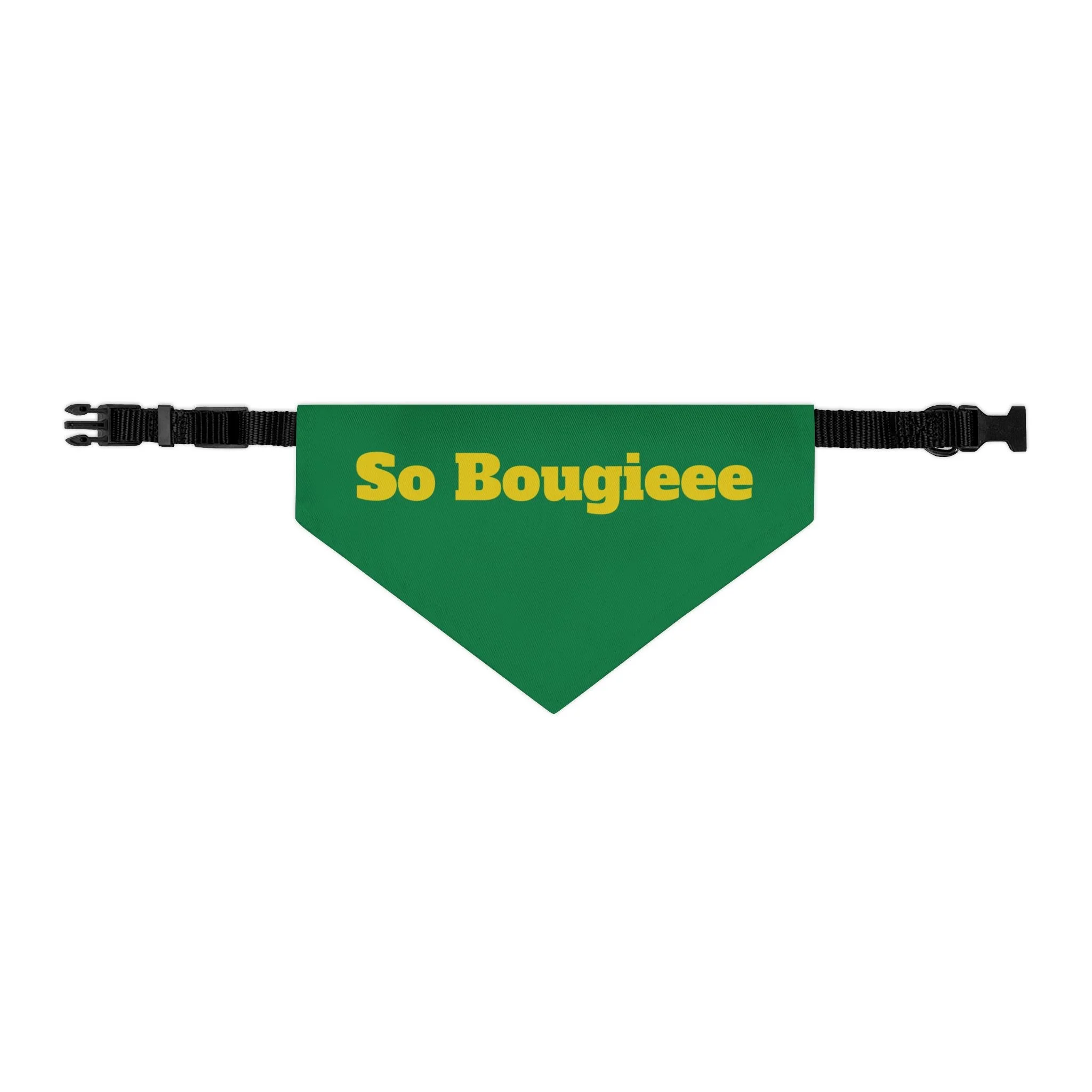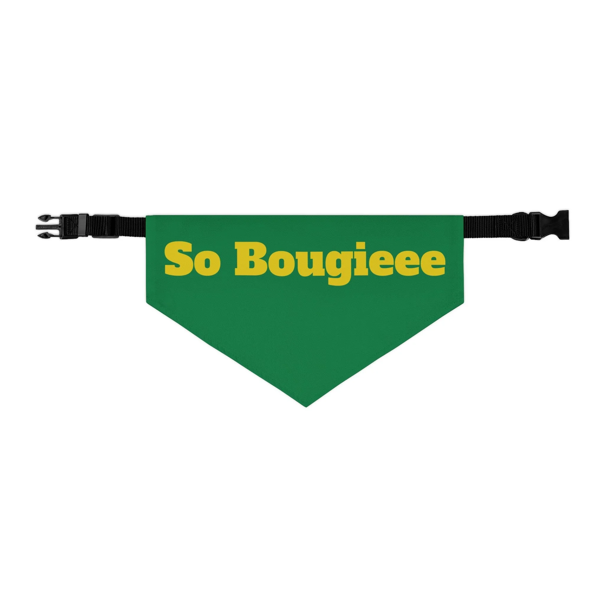 Let your pup strut with playful confidence in this bold pet bandana collar. The deep blue bandana wears bright, golden lettering that reads “So Bougieee,” giving a funny, sassy vibe that catches eyes on walks and at weekend hangouts. Lightweight polyester holds the color and shape, while hemmed edges and a secure adjustable black collar keep the bandana sitting neatly through playtime. It’s sized to fit a range of breeds, so small city dogs and medium-sized showstoppers can both wear a little attitude. Bring a moment of humor and personality to everyday outings — whether headed to the dog park, a café run, or a photo session — this bandana adds charm without fuss.