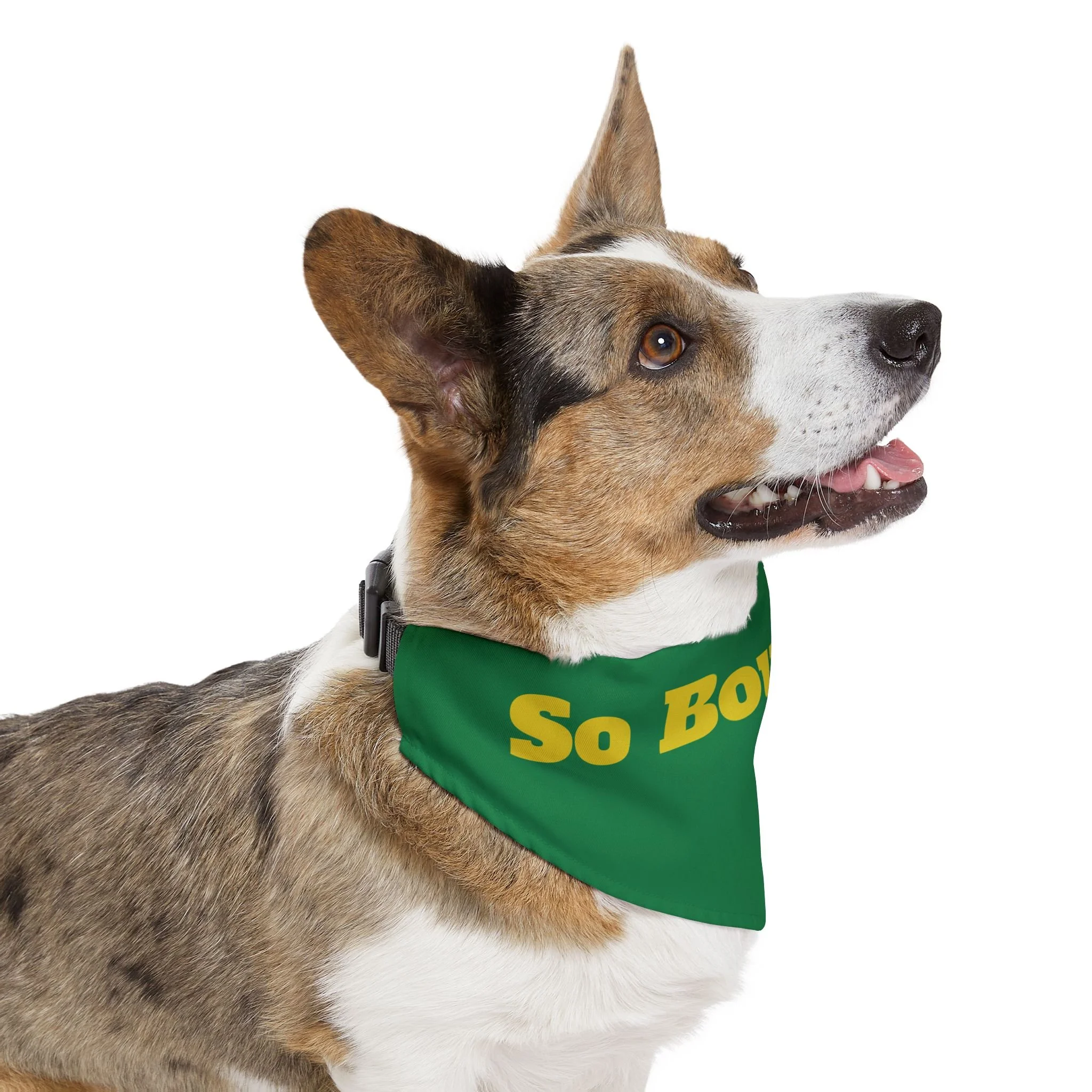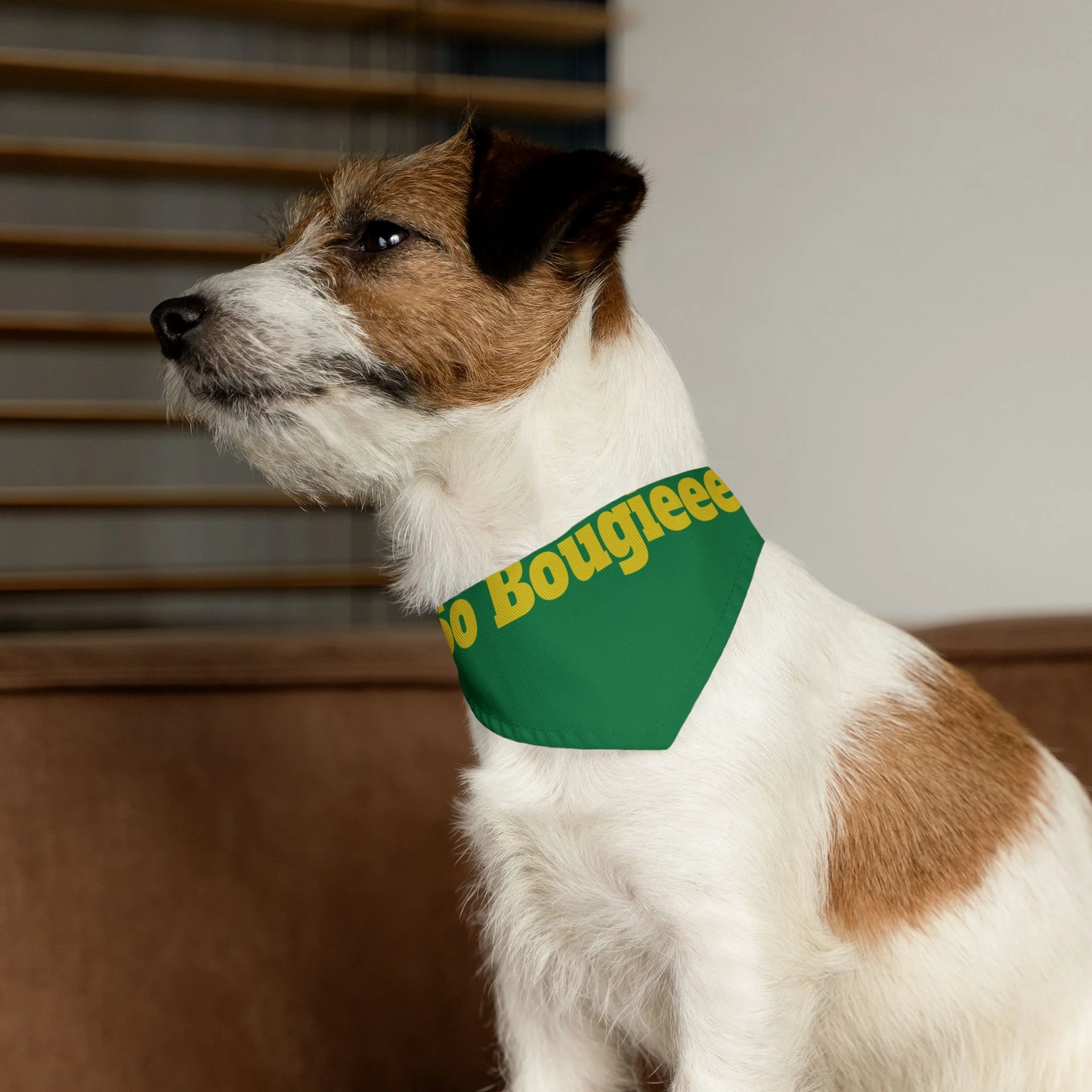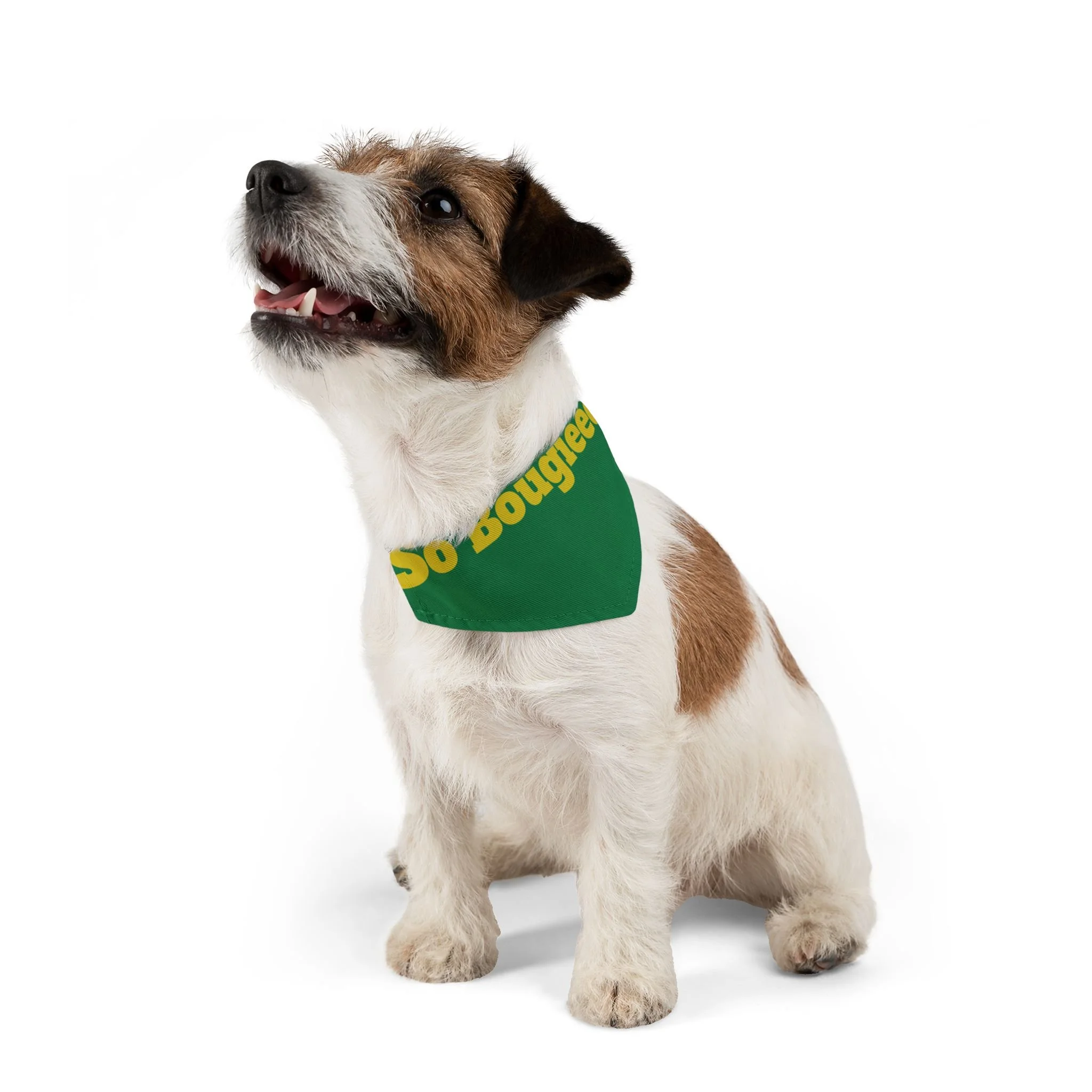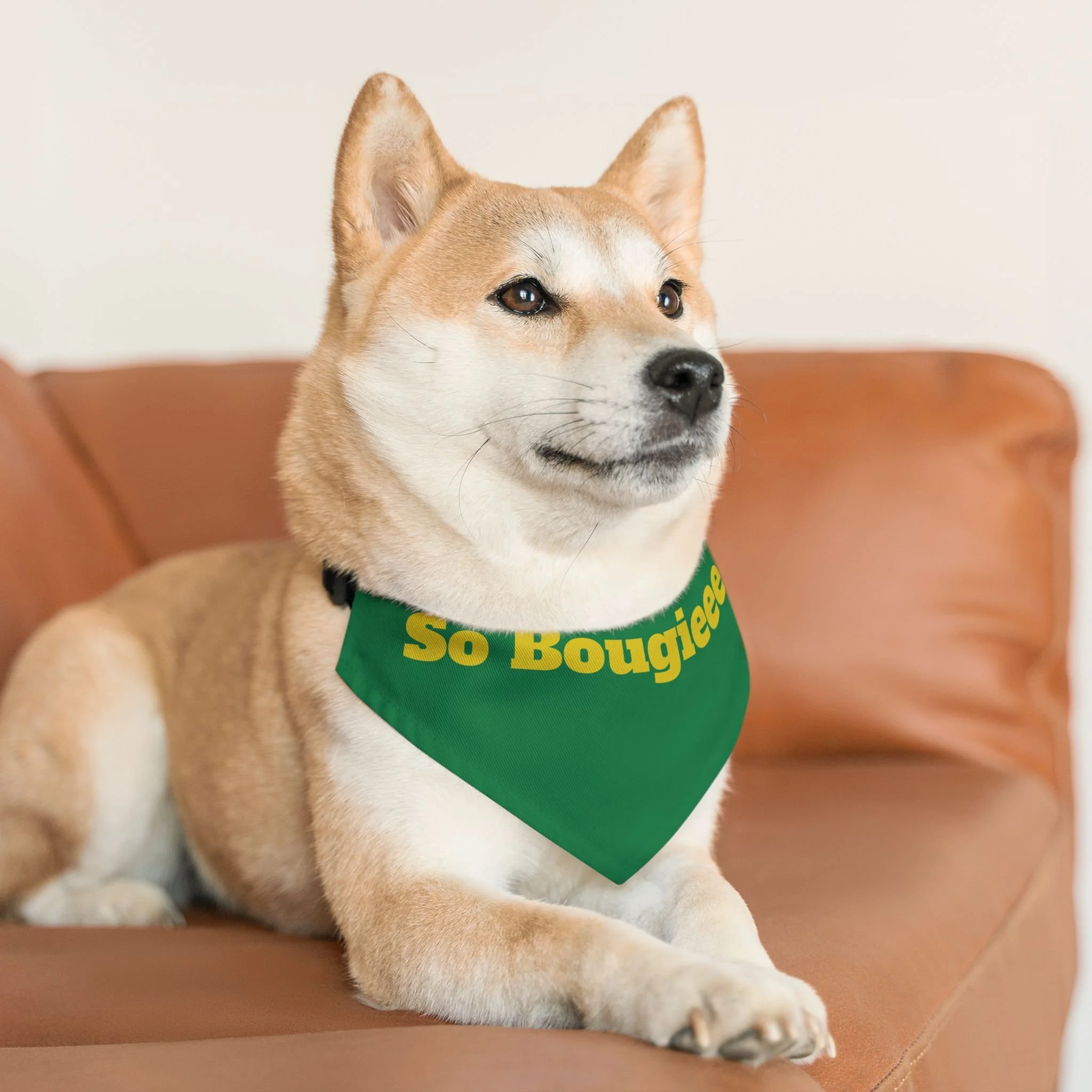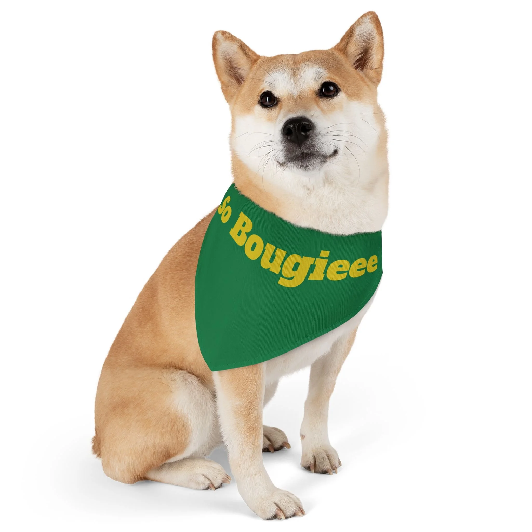 Let your pup strut with playful confidence in this bold pet bandana collar. The deep blue bandana wears bright, golden lettering that reads “So Bougieee,” giving a funny, sassy vibe that catches eyes on walks and at weekend hangouts. Lightweight polyester holds the color and shape, while hemmed edges and a secure adjustable black collar keep the bandana sitting neatly through playtime. It’s sized to fit a range of breeds, so small city dogs and medium-sized showstoppers can both wear a little attitude. Bring a moment of humor and personality to everyday outings — whether headed to the dog park, a café run, or a photo session — this bandana adds charm without fuss.