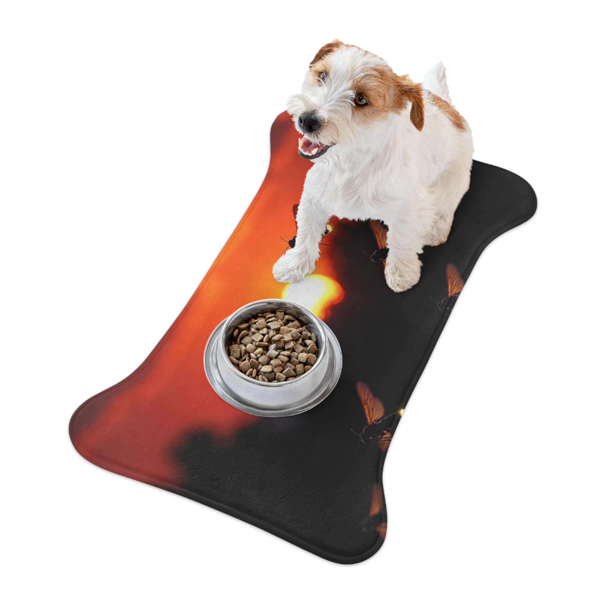 This bone-shaped feeding mat matches the Sunset Firefly Bowl perfectly, featuring a rich orange/red sunset sky with luminous fireflies glowing in flight against the dusk—creating a warm, enchanting golden-hour vibe. Waterproof top layer + non-slip rubber backing keeps bowls secure and protects floors from spills, water, and scratches.