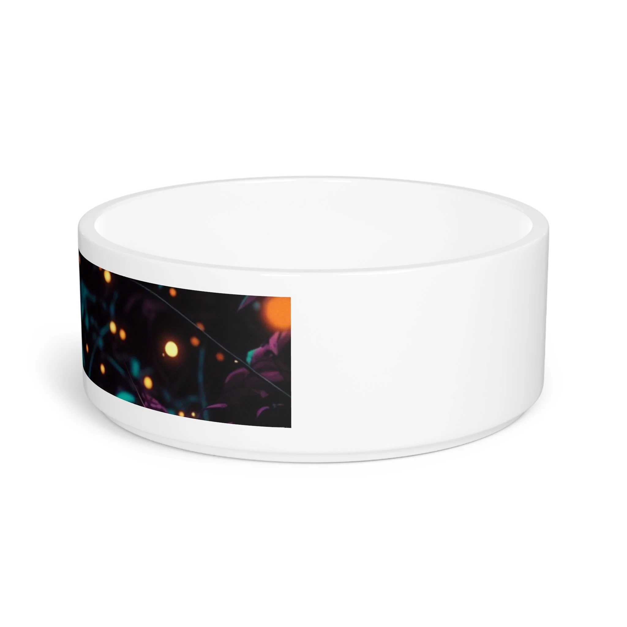 This enchanting bowl features a half-wrap outer band with a deep purple/teal night forest scene, dotted with glowing orange-yellow fireflies and subtle foliage—creating a whimsical, glowing fairy-tale vibe that's perfect for Bougie Buddy fans. Glossy white ceramic interior keeps it clean and practical for easy cleaning.