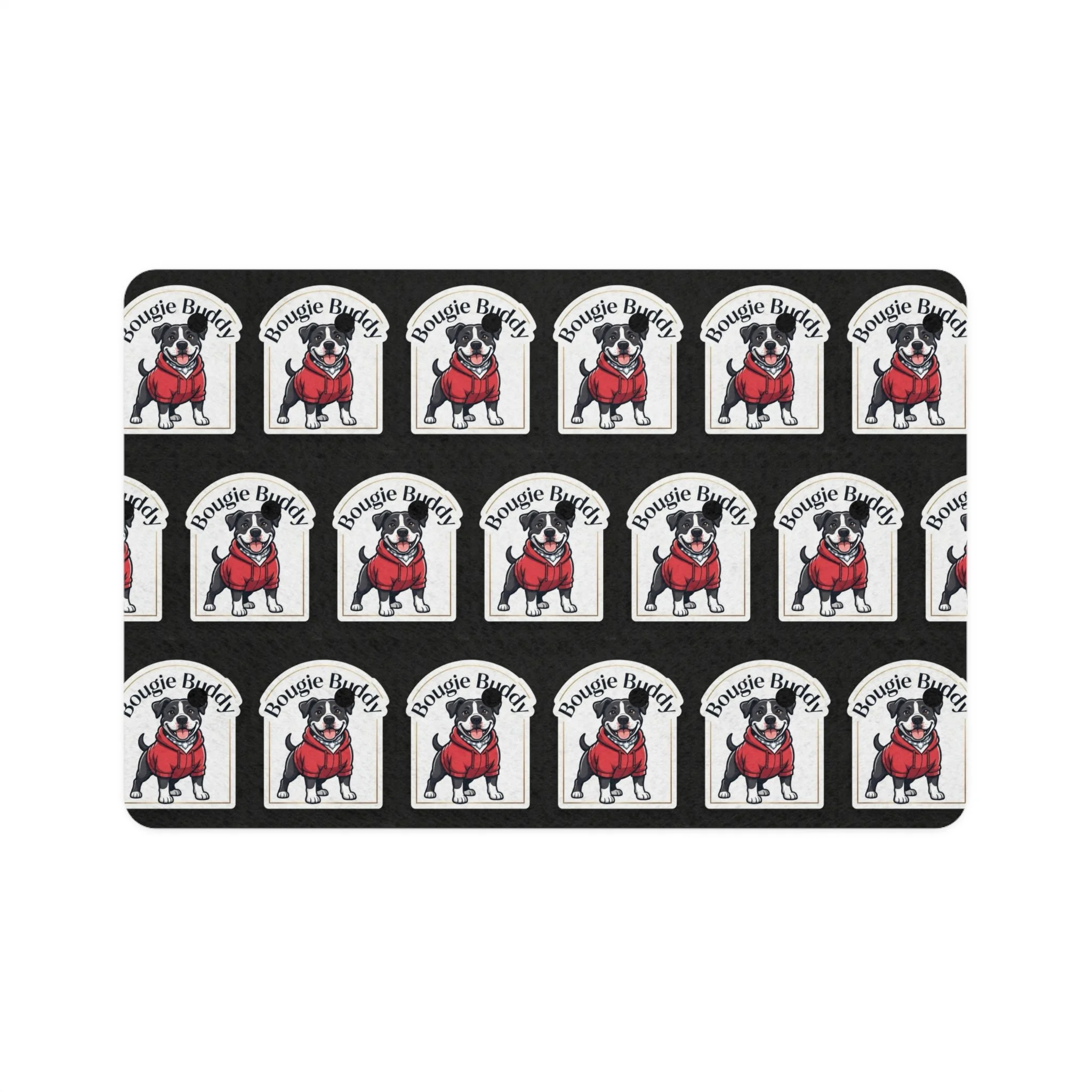 This rectangular feeding mat matches the Signature Bowl perfectly, featuring your iconic repeating pattern: pittie-style dogs in red hoodies with arched "Bougie Buddy" labels on a sleek black background—pure brand pride under mealtime. Waterproof top layer + non-slip rubber backing keeps bowls in place and protects floors from spills, water, and scratches.